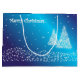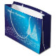 Grand sac-cadeau de la marine brillant avec une image, à l'avant et à l'arrière, de deux arbres de Noël revigorés avec des lampes étoilées blanches, une bordure de lampes étoilées blanches représentant la neige, et "Joyeux Noël" épelé de lampes étoilées blanches, sur le bleu. Voir la carte de voeux correspondante, l'enveloppe, le ballotin, l'étiquette-cadeau, le étiquette, l'autocollant rectangulaire et le papier d'emballage. Voir toute la collection de sacs cadeaux de Noël dans les TOUCHES SPÉCIALES| Section Favoris.