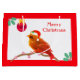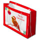 Petit oiseau carol de Noël mignon sur sac cadeau arrière - plan blanc et rouge. Le texte peut être customisé.