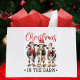 Célébrez la saison des fêtes avec ces adorables vaches portant des chapeaux de Noël festifs ! Ces animaux de ferme délicieux sont parfaits pour ajouter une touche de fantaisie à votre décor de Noël. Le texte dit Noël dans la grange.