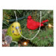 Perruche jaune et verte, ou perruche, dans un arbre de Noël visitant avec le sac cardinal rouge de cadeau de Noël d'amants d'oiseau d'ornement. L'IMAGE SERA SEULEMENT CORRECTE SUR CECI, LE SAC DE GRANDE TAILLE