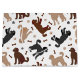 De mignons labradoodles en manteaux bruns, noirs et tans s'assoient, se tiennent et s'allongent avec des os de chien éparpillés et des empreintes de pattes sur un arrière - plan blanc.
