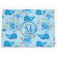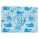 Jolie baleines bleues motif avec l'eau colorée splash oh garçon avec des gouttes dans différentes couleurs et un badge bleu clair transparent ronde avec un nom monogramme. Personnalisez en changeant le nom et l'initiale ou la personnaliser pour ajouter votre touche personnelle.