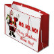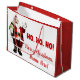 Sacs cadeaux de Père Noël avec un Père Noël jovial sur un fond rouge et blanc festif. Ce sac cadeau de Noël est facilement personnalisable avec le nom du destinataire. Vous pouvez également changer la couleur de fond de ce sac cadeau de Noël mignon.