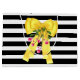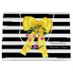 Sac cadeau élégant fait dans un motif à rayures horizontales noir et blanc gras. L'illustration graphique d'un grand arc en forme de satin jaune, avec des baies roses suspendues, orne l'avant et l'arrière du sac. Personnalisez le texte, sur le devant, pour lire ce que vous voulez.