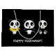 Deux petits pandas assis dans le noir avec un minuscule squelette. Un Panda porte un tee - shirt jaune avec le mot "meh" dessus.