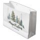 Célébrez la saison avec style avec ce grand sac cadeau de Noël rustique avec une forêt d'aquarelles d'arbres à feuillage persistant. Le design festif allie charme rustique et typographie moderne, ce qui le rend parfait pour vos cadeaux de Noël en famille et entre amis. Personnalisez avec votre nom de famille.