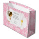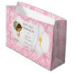 Première communion African American Girl Merci sac cadeau à présenter à vos invités après la cérémonie avec un motif rose Damask. Tout le texte peut être modifié selon vos propres exigences. Graphiques de BlackCatsMedia et Zenentrepdesigns.