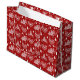 This festive Scandinavian gift bag features a vivid red background adorned with a delicate white folk-art pattern. A floral heart rests at the center, surrounded by a charming forest of varied Christmas trees and lightly falling snowflakes for a classic Nordic winter feel. The crisp red-and-white palette creates a bold, joyful presentation perfect for Christmas gifting. Shown here on the large bag, this design is also available on the small and medium sizes—wonderful for wrapping presents, holiday party favors, or special seasonal surprises. A beautiful way to add warm, old-world charm to your Christmas celebrations.