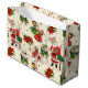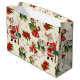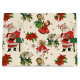 This gift bag features a charming retro Christmas pattern with a cream-colored background. The design includes repeating images of a jolly Santa Claus standing next to a green mailbox, a young girl in a red and green dress ringing a bell, bright red poinsettias, and clusters of holly and bells. Small snowflakes and starbursts are scattered throughout the pattern, giving it a vintage, mid-century holiday card aesthetic.