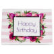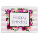 Un joli sac cadeau d'anniversaire avec un bouquet floral composé de roses rose clair et de pavots rose foncé avec beaucoup de feuilles verts luxuriants. Un cadre superposé au-dessus de heureux anniversaire (ou autre texte personnalisé) à l'intérieur. L'arrière - plan est une douce motif rayée rose pastel.
