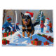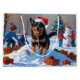 Illustration de vacances pleine de charme avec un chien gai jouant dans la neige, portant un chapeau de Père Noël et entouré de boîtes cadeaux colorées. Dans l'arrière - plan, les enfants construisent un bonhomme de neige à côté d'un sapin de Noël enneigé, créant un merveilleux pays hivernal. Parfait pour répandre la joie des fêtes et capturer la magie de Noël.
