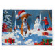 Illustration de vacances pleine de charme avec un chien gai jouant dans la neige, portant un chapeau de Père Noël et entouré de boîtes cadeaux colorées. Dans l'arrière - plan, les enfants construisent un bonhomme de neige à côté d'un sapin de Noël enneigé, créant un merveilleux pays hivernal. Parfait pour répandre la joie des fêtes et capturer la magie de Noël.