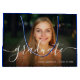Sac photo bleu classique avec le mot diplômé en script et nom/classe de détails ci-dessous.