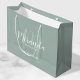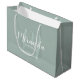 Sac cadeau Bridesmaids personnalisé avec nom de femme d'accueil personnalisé en blanc style de police de script moderne et monogramme en vert sage style de police de script moderne comme arrière - plan avec titre et date de mariage en blanc moderne sans serif style de police sur arrière - plan vert sage. Aussi parfait pour femme de ménage d'honneur, fille de fleurs, mère de la mariée et plus.
