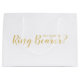 "Serez-Vous Porteur De Bague ?" Sac cadeau moderne Script blanc et or avec le titre "Will You Be My Ring Bearer?" en or style de police de script moderne sur arrière - plan blanc. Remarque : Les détails du papier sont simulés dans l'illustration. Il n'y aura pas de métal sur ce produit.