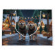This festive design captures the joyful spirit of the holiday season, featuring an adorable dogs.Nestled in a winter wonderland, complete with a decorated Christmas tree, and beautifully wrapped presents. Snowflakes gently fall, adding a magical touch to the scene, while the vibrant colors of the holiday decorations create a warm and cheerful atmosphere.