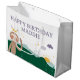 This Slumberkins Sloth birthday gift bag design features an adorable crowned sloth waving from a rolling green hillside beneath a soft pastel sky. A warm sunrise glows behind layered mountains while tiny birds, scattered stars, fluffy clouds, and delicate meadow details create a peaceful woodland celebration scene. “Happy Birthday” appears across the top with a custom name displayed prominently below, and a bold personalized age centered in the design to make the celebration extra special. The soothing color palette of sage green, golden yellow, soft lavender, and earthy brown gives the artwork a calm yet cheerful feel that pairs beautifully with a woodland or animal-themed party. With its sweet illustration style and personalized details, this Slumberkins sloth design makes birthday gifting feel thoughtful, charming, and full of warmth.
