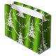 Un sac cadeau de Noël vert et coloré avec un motif d'arbres de Noël blancs et modernes et l'accueil festif de 'Be Merry', le tout sur un arrière - plan vert vibrant.