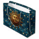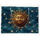 Sur un fond céleste étoilé, le visage serein d'un soleil doré stylisé.