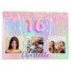 Un sac cadeau pour un Sweet 16, 16e anniversaire girly et glamour. Un arc-en-ciel, arrière - plan holographique unicorne en rose, violet, or rose et vert menthe avec gouttes de parties scintillant faux, la peinture goutte à goutte. Personnalisez et ajoutez 3 photos et un nom. Le numéro 16 est écrit avec une police de style ballon. Parfait comme un sac de fête ou comme un sac cadeau.