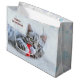 Grand sac cadeau avec une mignonne photo de Noël d'un chat tabby gris mordant joyeusement un chapeau santa rouge. Ses gros pattes moelleuses rendent cette photo très agréable.