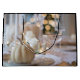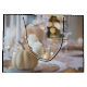 Sac cadeau avec une belle photo classe. Table à manger avec porcelaine fine et verrerie. Fancy or bokeh lumières dans l'arrière - plan. Une simple épaisse épaisse est posée sur une assiette.