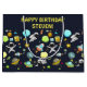 Sac cadeau d'anniversaire avec un motif mignon et coloré avec toutes sortes d'éléments thématiques de l'espace. Les images comprennent des astronautes flottant dans leurs combinaisons spatiales blanches. Étoiles, planètes et petits navires-roquettes cool, vaisseaux spatiaux et satellites. Design amusant et fou.