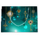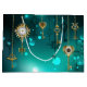 Or, clés antiques avec engrenages et cadrans accrochés sur chaînes dorées sur arrière - plan vert lumineux.