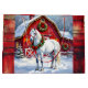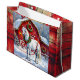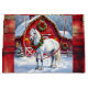 Un joli sac cadeau de Noël avec l'illustration d'un cheval blanc debout devant une magnifique grange rouge ornée de lumières de Noël et d'une couronne festive lors d'une journée d'hiver enneigée.