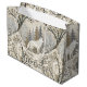 Ce sac cadeau de forêt d'hiver serein présente un majestueux loup blanc au centre, entouré d'arbres déchiquetés par la neige dans des tons doux de crème, brun, gris et bleu pâle. Un deuxième loup est subtilement niché dans le coin inférieur, ce qui laisse entrevoir une vie invisible dans le bois tranquille. Avec un mélange d'arbres à branches nues et à feuillage persistant, encadrés par des éléments décoratifs délicats, ce design évoque la beauté naturelle, le calme et une touche de magie hivernale. Idéal pour les amoureux de la nature, les amateurs d'animaux et les décors saisonniers ou imaginaires.
