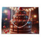 Un gâteau au chocolat décadent à trois étages occupe le devant de la scène, ses riches couches ornées d'une ganache au chocolat en cascade et d'une dispersion vibrante de vermicelles colorés. Chaque étage est couronné de cerises charnues et juteuses, et une seule cerise parfaite règne en maître tout en haut. La lueur chaude et invitante des lumières féeriques à l'arrière-plan crée une atmosphère festive, laissant présager une joyeuse célébration. La scène est un festin pour les yeux, promettant une explosion de saveur délicieuse à chaque bouchée.