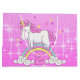Une mignonne licorne se dresse sur un arc-en-ciel coloré dans un ciel rose et brillant.