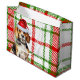Les Amoureux de les chiens adoreront recevoir ou donner ce mignon sac cadeau de saison des fêtes, avec un chien Beagle élégant sur un arrière - plan à motif rouge et vert des fêtes.