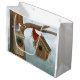 Cette jolie scène hivernale montre des voisins à plumes partageant l'esprit de la saison. Le pic offre une graine de tournesol à son ami cardinal, qui décore sa maison d'oiseaux. Des étiquettes de papier et de cadeaux coordonnés sont également disponibles.