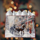 Sac cadeau de vacances avec une illustration victorienne classique d'un paysage urbain avec des bâtiments ornés de arcs rouges, des magasins de vacances et une calèche faisant son chemin dans la soirée enneigée.