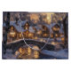 Sac cadeau de Noël confortable avec une aquarelle scène d'hiver d'une soirée dans un charmant village de Noël avec des maisons en pierre recouvertes de neige et éclairées par la lumière de la lune rivière coulant avec un pont de marche couvert de neige lanternes lumineuses au premier plan. Illustration affichée à l'avant et à l'arrière du sac et un arrière - plan de périwinkle solide pour correspondre à l'illustration.