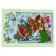 Une fée tout en rouge et vert sur fond de flocons de neige. Tout autour d'elle sont des symboles des fêtes.