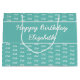 Dites "Joyeux anniversaire" avec ce thème de fête turquoise et blanc polyvalent qui est parfait pour tout âge, des tout-petits aux centenaires. Il convient aux garçons, aux filles, aux hommes, aux femmes et surtout à ceux qui célèbrent les anniversaires marquants. La conception graphique simple présente votre numéro d'âge répété dans un motif carrelé et transparent dans l'arrière - plan, tandis que les mots "Joyeux anniversaire" et un nom sont imprimés sur le devant. Pour personnaliser la conception, utilisez le modèle de texte fourni pour ajouter votre message, événement, nom, initiale ou monogramme. Ces sacs sont une excellente façon d'ajouter une touche personnelle lorsque vous donnez un cadeau spécial à des amis ou à la famille. Le design polyvalent le rend adapté à toutes les occasions, qu’il s’agisse d’une fête personnelle ou d’un événement professionnel, où vous devez afficher un nombre de 0 à 999. Il suffit de modifier le texte pour qu’il corresponde au numéro de l’événement.