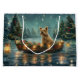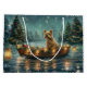 Jetez un coup d'oeil à la magie de la saison des Fêtes avec cette illustration magnifiquement détaillée, montrant un chien fier assis dans un bateau à la décoration festive, glissant à travers un lac serein de Noël. Les lumières scintillantes des pins voisins se reflètent dans l'eau, projetant une lumière chaude et festive qui renforce l'ambiance cosy. Des ornements pendent des côtés du bateau, tandis que des lanternes brillantes éclairent le chemin, créant une scène qui capture l'essence véritable de la chaleur et de la joie de Noël. Cette oeuvre nostalgique apporte une touche de magie de vacances à tout espace, parfait pour ceux qui chérissent l'esprit de la saison.