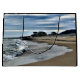 Assis sur la plage le soir, en regardant les nuages de pluie approchant se déplacer à travers le ciel. La marée monte et la petite ville locale de Tywyn se manifeste au loin. Gwynedd Wales UK.