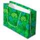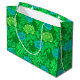 Grand sac cadeau dans un vintage William Morris, Art Nouveau, imprimé floral de chrysanthèmes stylisés, numériquement rehaussé et coloré, en vert citron clair et profond et aqua, sur un arrière - plan vert émeraude