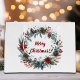 Un élégant design de couronne d'hiver avec des fleurs de Noël, des cônes de pin et des baies d'hiver sur une branche de sapin.