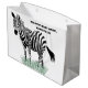 Ajoutez une touche sauvage aux cadeaux avec ce sac cadeau personnalisé. Il présente une illustration réaliste d'un zèbre en noir et blanc debout dans une herbe verte avec votre propre message personnalisé en caractères noirs gras.
