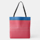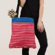 Ce sac fourre-tout est présenté avec un design d'impression rayé rouge et blanc amusant avec un panneau de couleur bleu marine. Grande taille affichée. A des sangles noires. Customisez cet objet ou achetez tel que conçu.