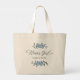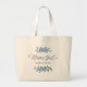 Un sac de fleuriste botanique floral chic pour la mariée, une fleur bleue de verdure florale, pour votre fille d'honneur demoiselle d'honneur calligraphie script, une typographie féminine chic élégante, une fête de mariage enterrement de vie de jeune fille, un style de jardin romantique girly, une demoiselle d'honneur stylée, un design floral classique traditionnel, avec du delphinium bleu printemps été, un cadeau personnalisé pour la fête de mariage
