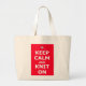 Ce beau grand sac fourre-tout pour tricoteur a le slogan "Keep Calm and Knit On", en blanc sur rouge avec une boule de fil et des aiguilles de tricot. Ce sac fourre-tout est parfait pour un tricoteur pour garder le fil et les aiguilles dedans.