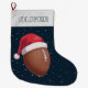 American Football Ball Red Santa Hat Name Large Christmas Stocking. The design has a football ball with a red Santa hat on a dark blue background with white snowflakes. Personalize with your name.