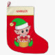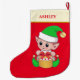 Elfe de Noël moderne mignon avec boîte cadeau sur rouge arrière - plan Noël Stocking. Stockage rouge et ivoire.
