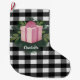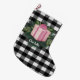 Ajoutez une touche festive à votre manteau de cheminée cette saison de vacances avec un Buffalo Plaid Christmas Gift Stocking. Le design empilant présente un cadeau de Noël rayé enveloppé décoré de la verdure de vacances contre un arrière - plan en vichy noir et blanc avec un espace que vous pouvez ajouter votre nom pour la personnalisation. Autres cadeaux et objets de vacances disponibles avec ce design aussi.
