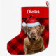 Des nuances de rouge dans un grand plaid de buffle qui crée un bas de Noël doux avec une aquarelle illustration d'un chien prêt pour les vacances, Chesapeake Bay Retriever chien et le nom de votre petit sur les deux côtés.